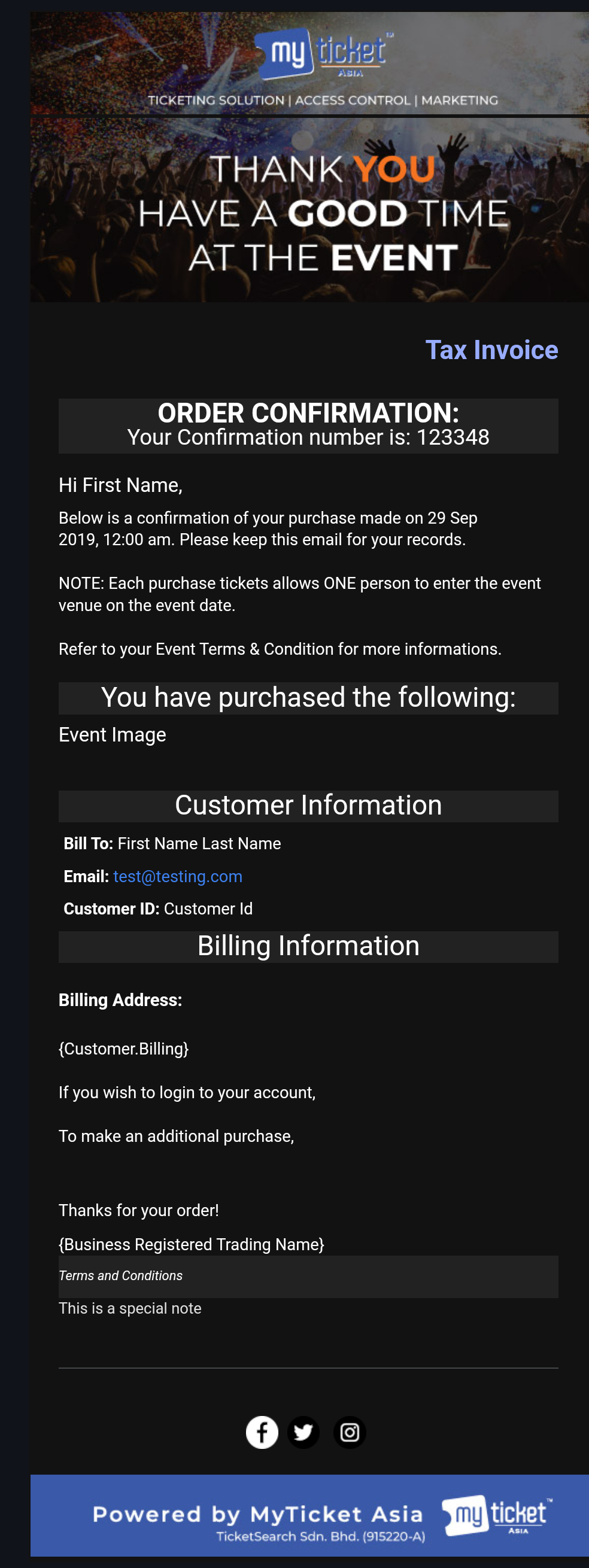 Have your own set of Terms of Conditions for your event. This will be sent to each customer upon purchase.