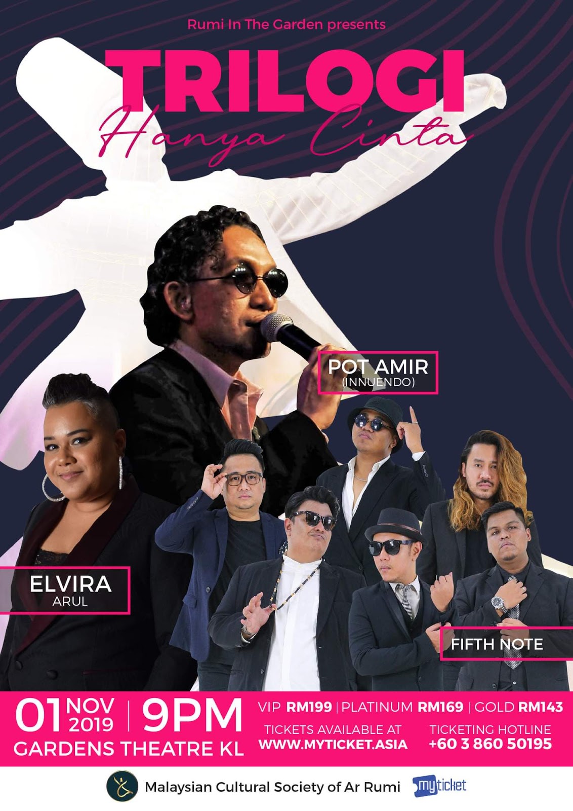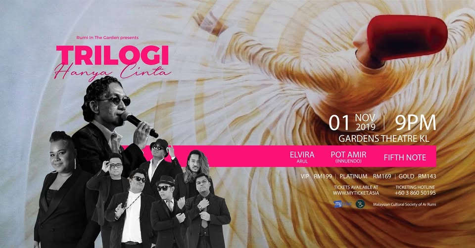 Inspired by one of Rumi’s countless phrases “Exhale Only Love”, comes the harmonic musical experience that is “Trilogi Hanya Cinta” curated and helmed by Pot Amir of the award-winning Soul R&B sensation, Innuendo – Malaysia, TV3’s Mentor Otai Champion Elvira Arul and FifthNote, an a cappella/R&B outfit made of 6 young men. Other guest performers include There will also be a presentation of the first Salam Award for “Belaian Jiwa by Innuendo” for Innuendo and the composers of ‘Belaian Jiwa’ from Carefree. Other guest performers include Azan Addin & Zain Hamid of RUFFEDGE also Whirling Dancers. Live music is provided by Alkaline Radiostar ROSIN. Only 313 tickets are available from RM143 onwards ( via www.myticket.asia ) and proceeds would be channelled towards Malaysian Cultural Society of Ar Rumi, an NGO promoting love & unity.